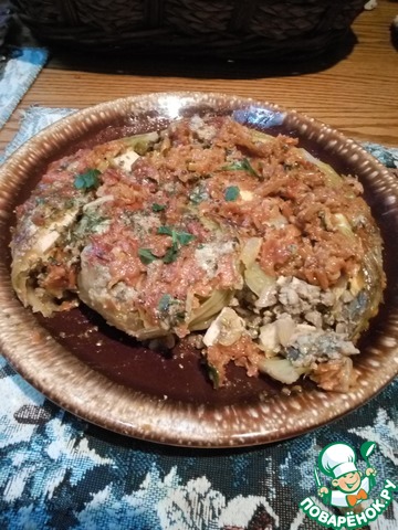 Завиванец -блюдо украинской кухни. По сути-это один большой голубец. Обязательно используется гречка, но никак не рис. Мне очень нравится этот завиванец с грибами и рассыпчатой гречкой, с привкусом жареных грибов. Это вполне самостоятельное блюдо. Я пробовала вместо грибов обжаренный фарш, тоже очень вкусно. Если будет трудно для вас завернуть все листья сразу, можно начинить каждый лист отдельно и так же завернуть в рулет, сложить в форму по кругу. Просто тогда вы его полностью на тарелку не перенесете.