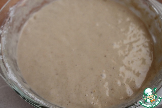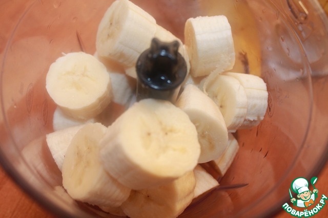 Добавить банановое пюре, масло, просеять муку с разрыхлителем и перемешать миксером до однородной массы.