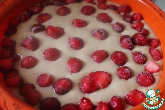 Тесто вылить в форму, смазанную маслом, выложить сверху ягоды клубники. Выпекать при 200 градусах 35 минут.