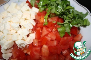 Мелко нарезать томаты, моццареллу и листочки базилика.