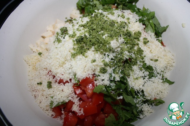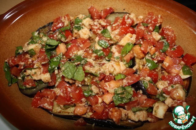 Затем выкладываем томатно сырную смесь и повторяем слои.