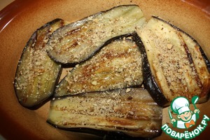 На дно формы выкладываем баклажаны и присыпаем ореховой смесью"Дукка"