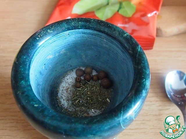 В ступке растолочь оба вида перца с тимьяном и нарезанной на кусочки лаврушкой. -