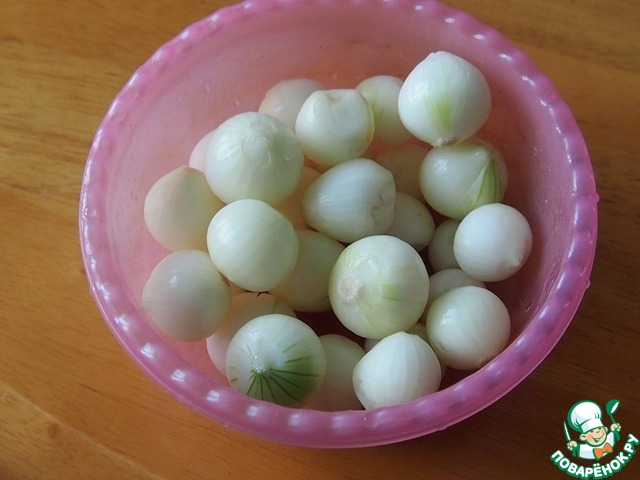 Для подливки очистить лук, сделать на "попке" крестообразный надрез для того, чтобы луковки не распались. Бросить в кипящую воду на две минуты, затем охладить в холодной воде.