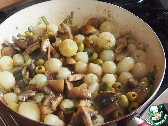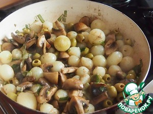 Затем добавить грибы к луку, туда же добавить и оливки. Все перемешать и минутку потушить.