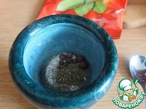 В ступке растолочь оба вида перца с тимьяном и нарезанной на кусочки лаврушкой. -