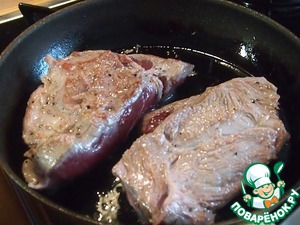 На сковороде на раскаленном оливковом масле обжарить мясо со всех сторон до получения белой корочки, чтобы закрыть поры и уменьшить вытекание сока при дальнейшем приготовлении. Сложить мясо в посуду для запекания.