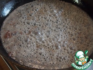 В сковороду, где обжаривалось мясо, добавить 50 мл вина и поварить несколько минут, пока выпарится алкоголь.