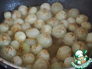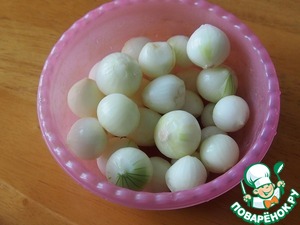 Для подливки очистить лук, сделать на "попке" крестообразный надрез для того, чтобы луковки не распались. Бросить в кипящую воду на две минуты, затем охладить в холодной воде.
