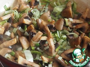 В другой сковороде разогреть 2 ложки оливкового масла, добавить 2 ложки сливочного, подождать, пока масло перестанет пениться, бросить туда грибы и мелко нарезанные листья лука-порея. Посолить, поперчить и немного обжарить. -