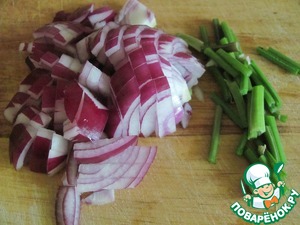 • Лук порезать кубиком. Если у вас есть черешковый сельдерей, то порезать пару черешков. У меня его нет, поэтому я просто порезала стебли.