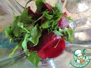• Свеклу порезать и положить в блендер. Добавить листики сельдерея.
