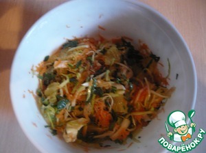 Слегка мнем капусту, морковь и пересыпаем сахаром 0,5 ч. л.