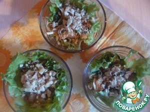 Порционные салатники прокладываем листьями салата, выкладываем наш салатик и поливаем соусом и посыпаем тертым орехом кешью.