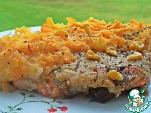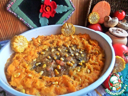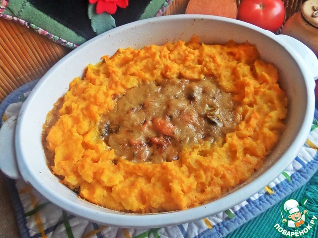 Вообще это рыбный пирог от Ю. Высоцкой, но я упустила креветки-заменила их на Норвежский лосось... В картофель добавила батат, который всё больше популярен в наших магазинах и уже не является экзотикой (интересно было попробовать). Сам принцип подачи/запекания оставила тот же. От такого нежного блюда/пирога не оторваться! Прошу к столу.