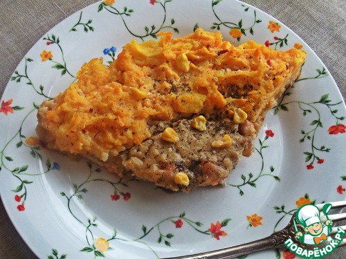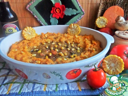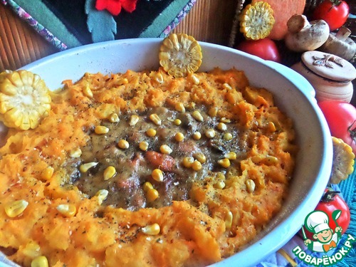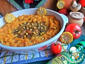 Верх запеканки посыпать кукурузными зёрнами. Можно посыпать сухой мятой.