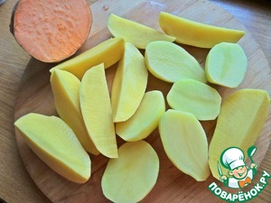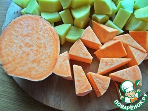 Батат (сладкий картофель), тоже на кусочки. Батат по внешнему виду похож на огромный клубень картофеля, а внутри по текстуре-тыква и варится довольно быстро. Знаю, что в Америке батат готовят часто, запекают в духовке половинками..., как мы с Вами любим запекать картошечку в кожуре. Вкус сладковатый, на любителя.