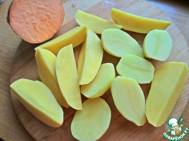 Забегая вперёд, тут овощи уже сварены. В сочетании с картофелем батат не доминирует, но добавляет свой вкус (не навязчиво) и цвет безусловно.
