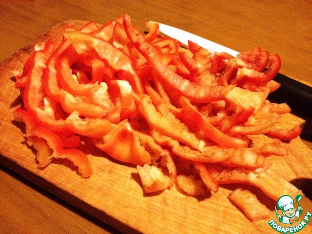Вымыть и обсушить болгарский перец, удалить семена и нарезать соломкой.