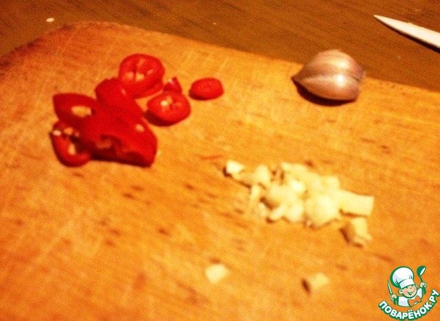 Чили вымыть, нарезать колечками не удаляя семян. Чеснок очистить и измельчить.