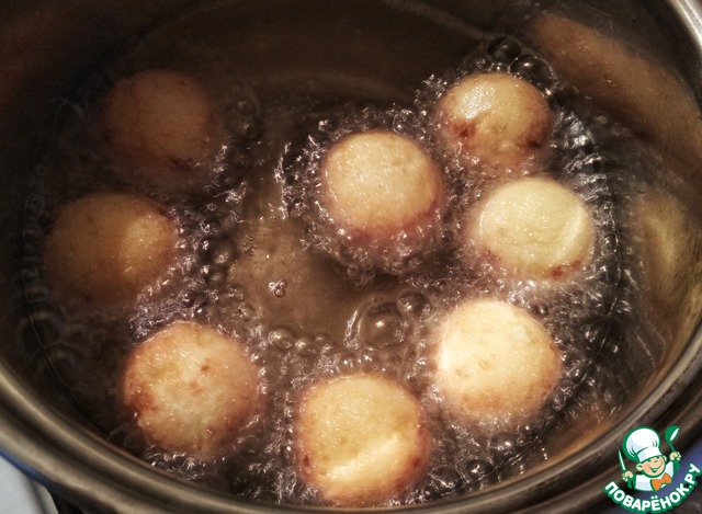 Как только масло раскалилось, отправляем несколько шариков в него. Они должны всплыть. Некоторые могут чуть прижариться ко дну. Это не должно вас пугать. Просто шумовкой подденьте и все. Мешать все время не требуется, лишь иногда. Шарики сами крутятся в масле
