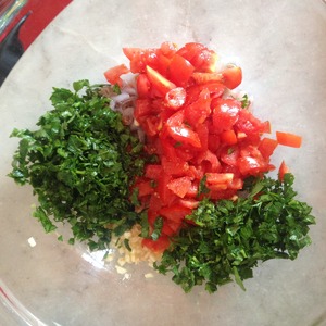 Затем мелко нарезать чеснок, помидоры черри и петрушку