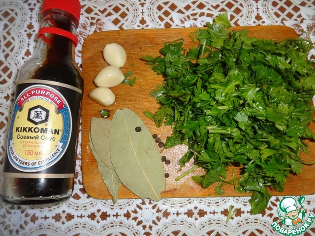 Порезать зелень. Приготовить пеерц горошком, лавровый лист, ческо, соль...