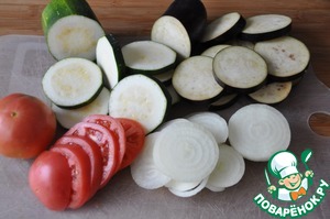 Берём овощи: баклажан, кабачок, помидоры и лук. Всё режем кольцами толщиной около 7 мм. Желательно брать овощи одинакового диаметра для большей презентабельности блюда.