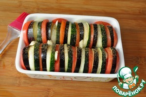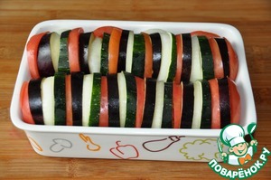 Берём удобную форму для запекания, желательно керамическую, смазываем маслом и чередуя плотно кладём кольца овощей: баклажан, помидор, кабачок, лук. По краям для сочности я также положила кольца помидора и сбоку для плотности: лук и помидор.