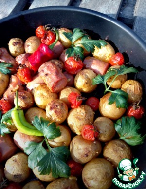 Картофель, запеченный с помидорами и сосискамм