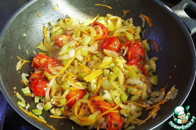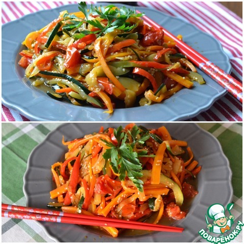 В воке разогреть, но не перекаливать масло. Быстро и постоянно помешивая обжарить сначала кабачок и морковь, затем лук и перец. Овощи должны лишь слегка подрумянится, оставаясь хрустящими.