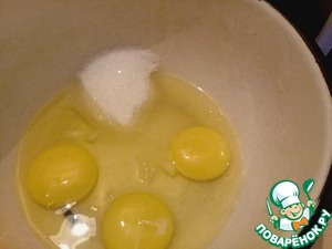 Добавить разрыхлитель и просеянную муку, хорошо все перемешать.