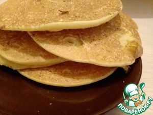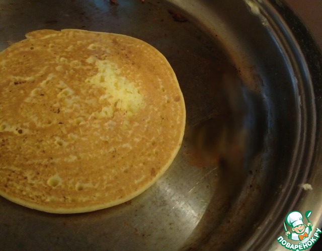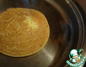 Разогрейте на плите сковородку. В центр наливать по 3 ст. л. теста. Как только на поверхности появились пузырьки, переворачиваем и жарим с другой стороны.