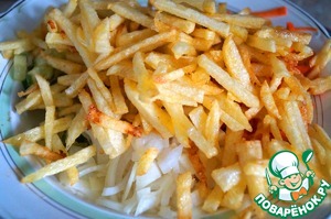 Картофель нарезать тонкими кружочками, а потом тонкой соломкой. Если есть специальная терка, процесс пойдёт быстрее и радостнее. Обжариваем картофель партиями в кипящем масле.