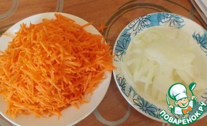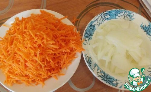 Лук и морковь тонко шинкуем.