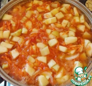 Ставим на огонь, после закипания кладем сахар, вливаем растительное масло, хорошо перемешиваем и закладываем овощи. Доводим до кипения и варим на тихом огне 20 минут.