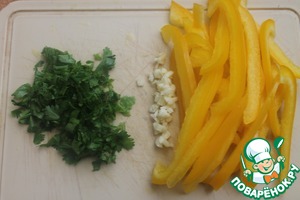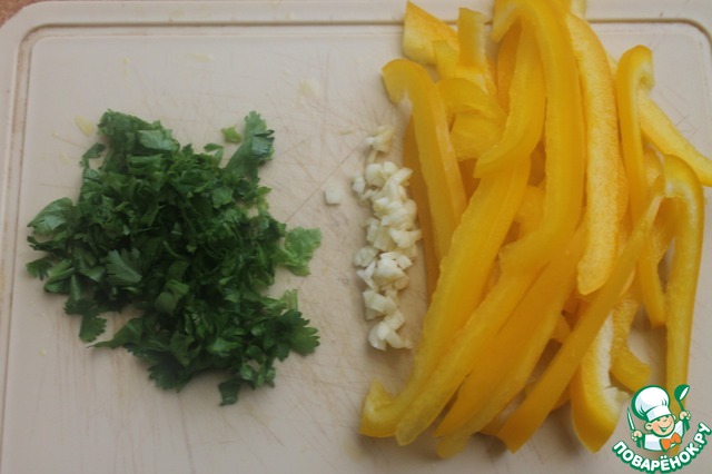 Болгарский перец нарежем соломкой, чеснок и кинзу мелко порубим.