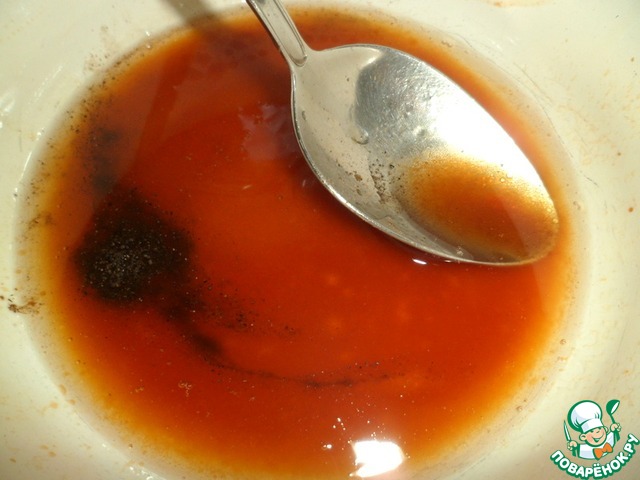 • Приготовить соус-заправку. Смешать в мисочке- яблочный уксус, соевый соус ТМ Киккоман легкий, масло, мед, черный молотый перец.