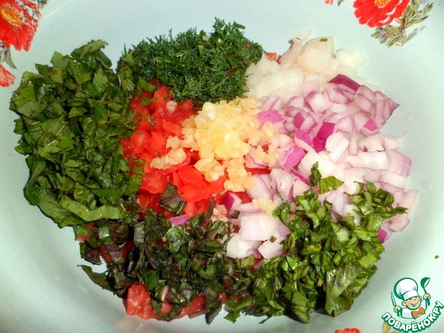• Сложить помидоры в мисочку и добавить к ним- нарезанный мелко кубиками лук, мелко нарезанную всю зелень, давленный чеснок