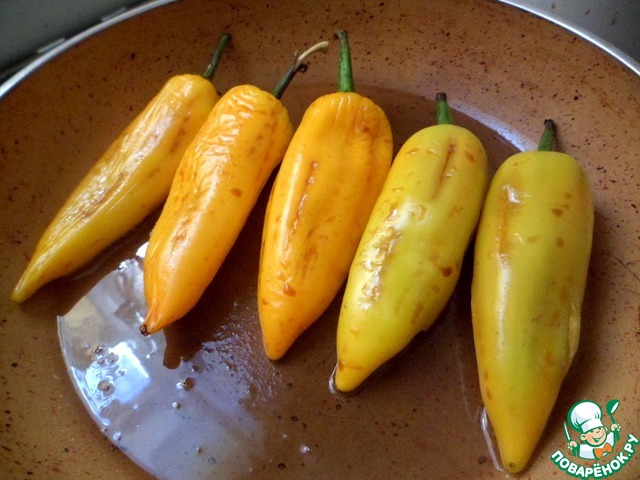 • Разогреть сковороду с маслом и выложить перцы, жарить на маленьком огне, с двух сторон под крышкой до готовности.