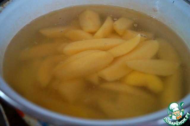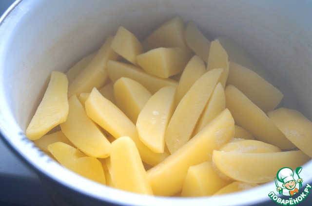 Доводим подсоленную воду до кипения и опускаем туда дольки картофеля. Варим минут 5 максимум, до полуготовности. В данном конкретном случае картофель лучше не доварить, чем переварить. В среднем, достаточно 3 минут. Смотрите сами, время во многом зависит от сорта картофеля.