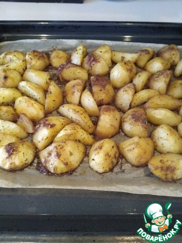 Выкладываем картофель на смазанный растительным маслом противень и ставим в разогретую до 180 градусов духовку на 15-20 минут, до зарумянивания.