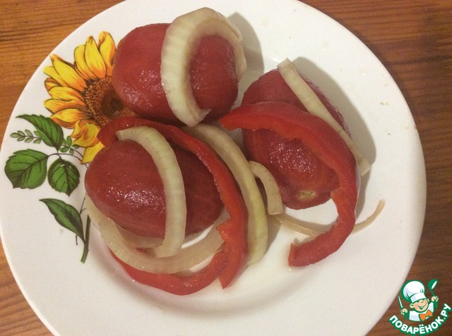 Помидоры залить кипятком на минуту, затем снять шкурку. -