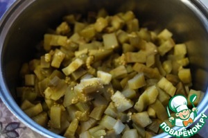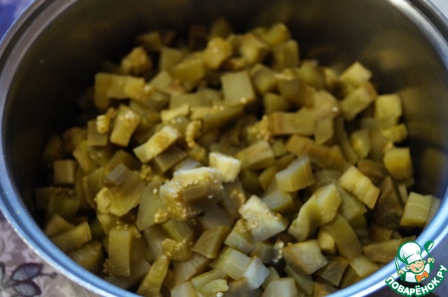 Баклажаны очистить от кожуры, нарезать кубиками, и отварить в кипящей, слегка подсоленной воде, в течении 3-5 минут. Откинуть на дуршлаг и дать стечь.