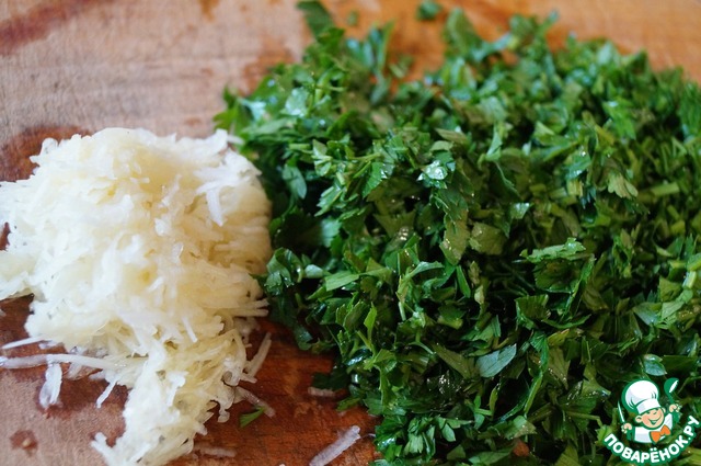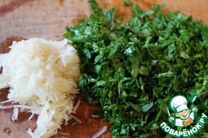 Зелень измельчить, чеснок натереть на мелкой терке или пропустить через пресс. У меня к сожалению была только петрушка, но Вы берите любую зелень по своему вкусу, подойдет и кинза и базилик, и укроп.