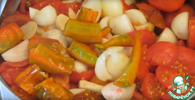 В кастрюлю с толстым дном нарезаем крупно помидоры, сладкий перец, горький перец с семечками (убираем только хвостик), чеснок, лук. Ставим на большой огонь тушиться.
