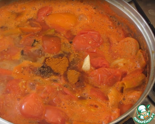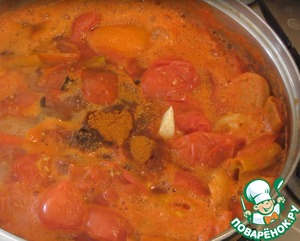 Добавляем приправы. Тушим, пока смесь не уварится в два раза. Когда смесь уварилась, это примерно 2 часа.