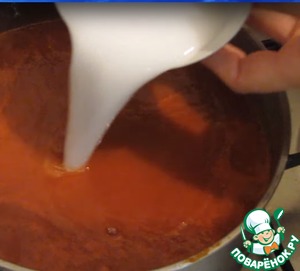 Когда закипит, вливаем тонкой струйкой крахмал, разбавленный в холодной воде, сразу перемешиваем, чтобы не образовалось комочков, добавляем сахар, соль и уксус. Доводим до кипения. Кипятим 5-10 минут, чтобы сахар и соль впитались, пробуем на вкус.