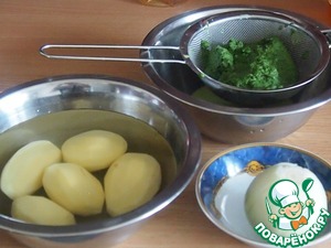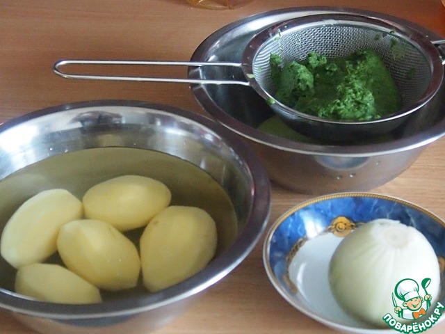 • Шпинат разморозить, слегка отжать излишнюю влагу. Можно на ночь положить его сито, вода стечет. Шпинат лучше брать не в виде пюре, а в виде порезанных листьев. Почистить картофель и лук.