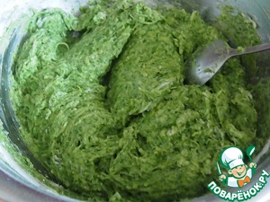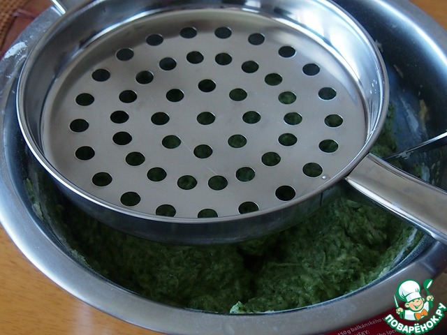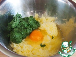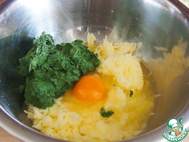 • Картофель натереть на мелкой терке. Если картофель дает очень много сока, то нужно слегка отжать лишнюю влагу, но не досуха. Добавить соль, яйцо, шпинат и муку.